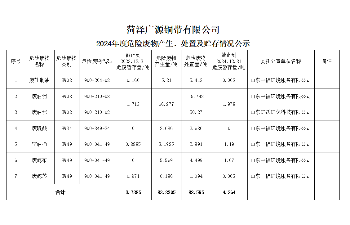 2024年度危險廢物產(chǎn)生、處置及貯存情況公示(菏澤廣源銅帶有限公司)