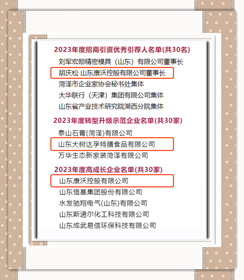 2月19日,在菏澤市委、市政府召開的“新春第一會(huì)”——全市高水平開放暨高質(zhì)量招商引資大會(huì)上,菏澤城投控股集團(tuán)權(quán)屬企業(yè)大樹達(dá)孚公司被市委、市政府評為“2023年度轉(zhuǎn)型升級示范企業(yè)”,康沃控股公司被市委、市政府評為“2023年度高成長企業(yè)”、公司董事長胡慶松獲得“優(yōu)秀引薦人”榮譽(yù)稱號。